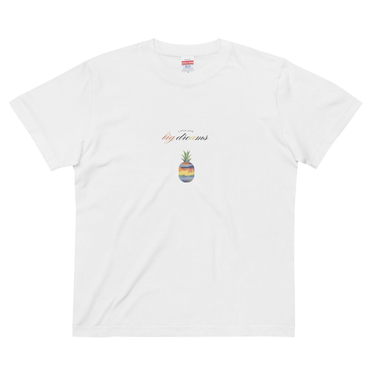 パイナップルのArtと”Little joys big dreams"のロゴが、コーディネートに色を添えます。